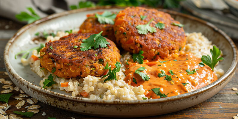 Bio-Linsen-Bratlinge mit Zartweizen & Tomatenrahmsoße