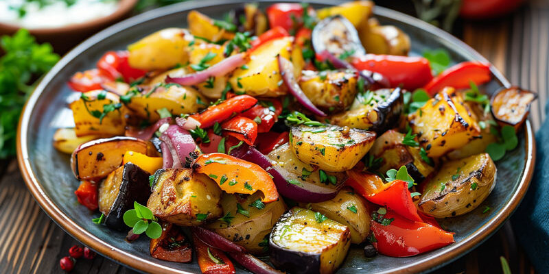Ofen-Bunte Schwenkkartoffel-Gemüsepfanne mit Joghurt-Kräuter-Creme